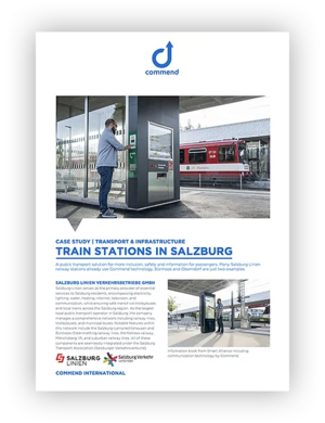 The train stations were equipped with an information kiosk from Smart Alliance. Integrated in these from Commend are our IP intercom module im6, I/O extension module EB3E2A-AUD, the camera module cm1, loudspeaker LS15, two MIC 480, and haptic buttons.