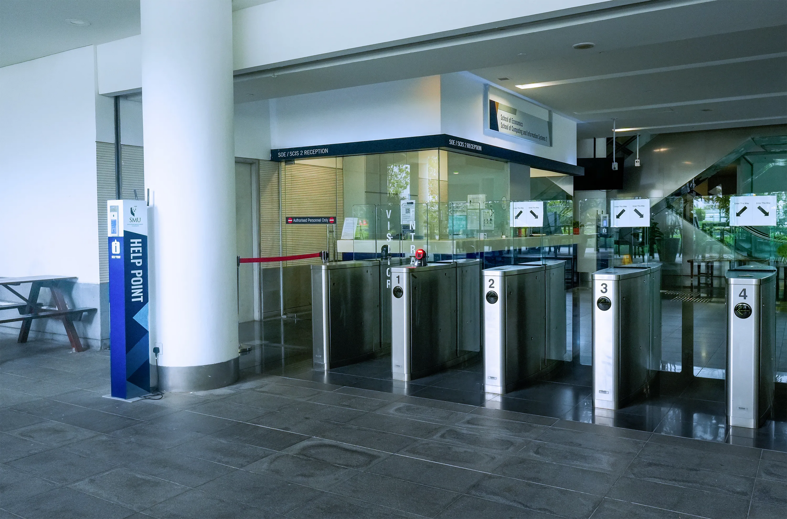 University help point next to electronic access gates providing secure entry and visitor assistance